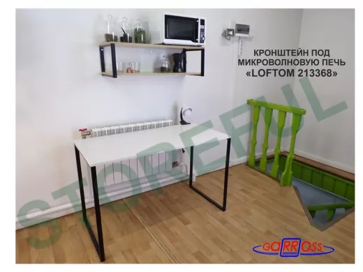 • Полка надежно крепится к стене при помощи анкеров или шурупов с дюбелями, на ней можно разместить микроволновую печь, кухонную технику, посуду, специи