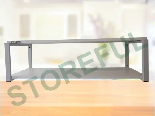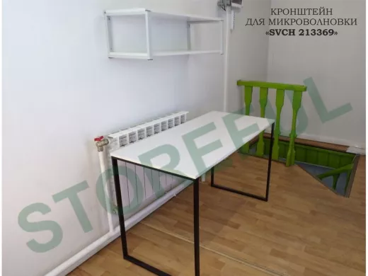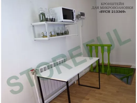 • Полка надежно крепится к стене при помощи анкеров или шурупов с дюбелями, на ней можно разместить микроволновую печь, кухонную технику, посуду, специи