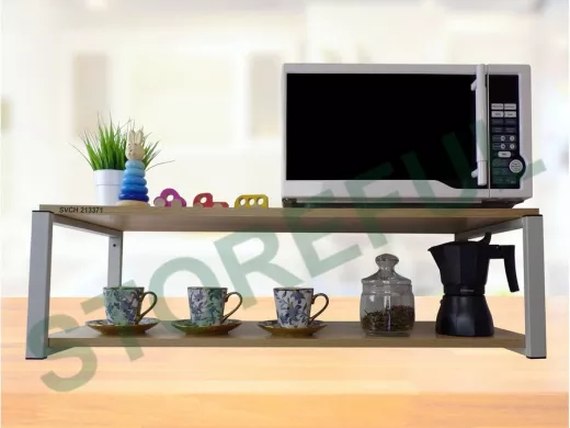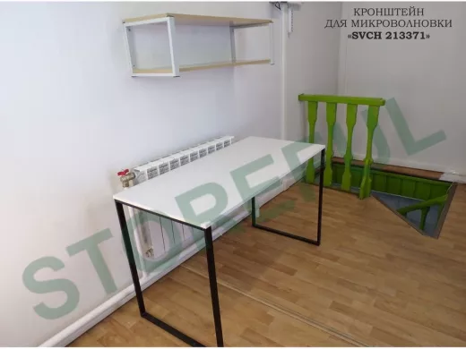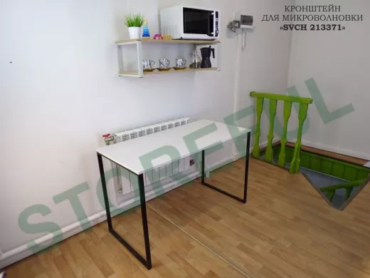 • Полка надежно крепится к стене при помощи анкеров или шурупов с дюбелями, на ней можно разместить микроволновую печь, кухонную технику, посуду, специи