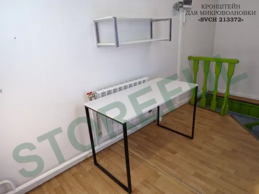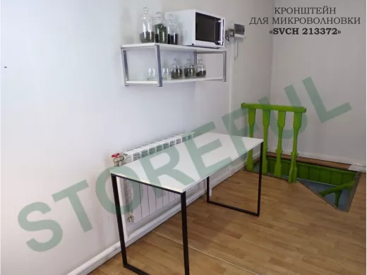 • Полка надежно крепится к стене при помощи анкеров или шурупов с дюбелями, на ней можно разместить микроволновую печь, кухонную технику, посуду, специи