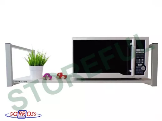 • Полка надежно крепится к стене при помощи анкеров или шурупов с дюбелями, на ней можно разместить микроволнрвую печь, кухонную технику, посуду, специи