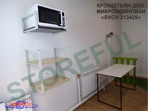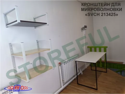 • Полка надежно крепится к стене при помощи анкеров или шурупов с дюбелями, на ней можно разместить микроволновую печь, кухонную технику, посуду, специи