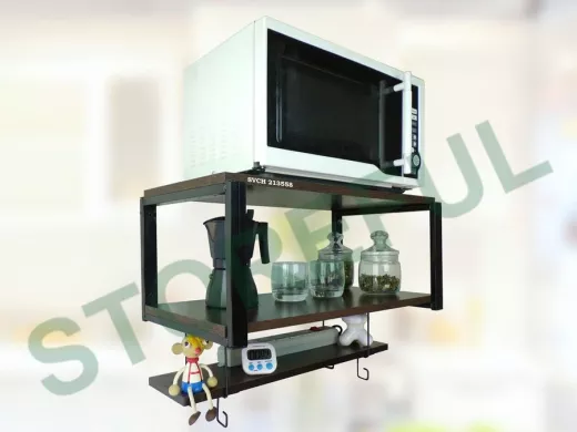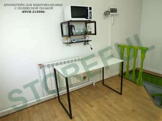 • Полка надежно крепится к стене при помощи анкеров или шурупов с дюбелями, на нее можно разместить микроволновую печь, кофемашину, тостер и другую кухонную технику, посуду, специи, различные необходимые мелочи