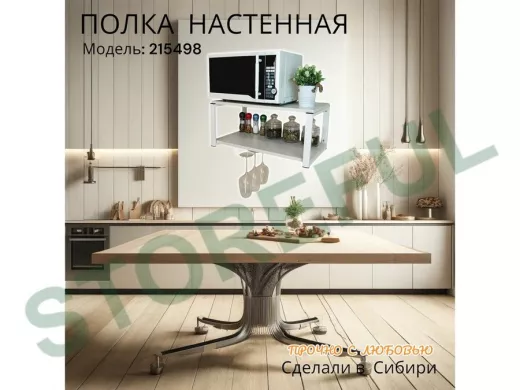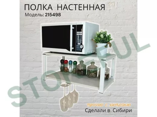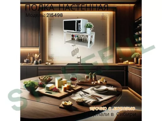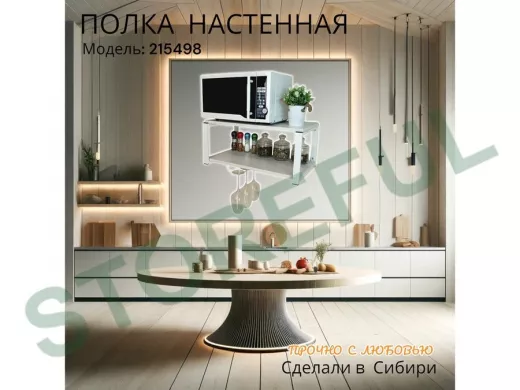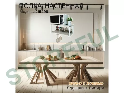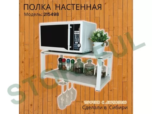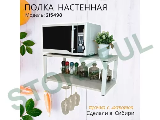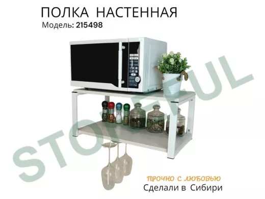 • Полка надежно крепится к стене при помощи анкеров или шурупов с дюбелями, на ней можно разместить микроволновую печь, кухонную технику, посуду, специи