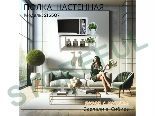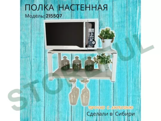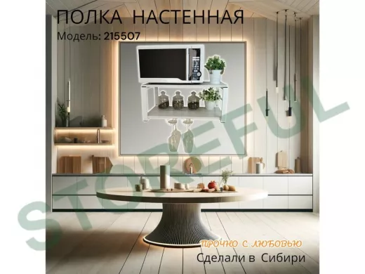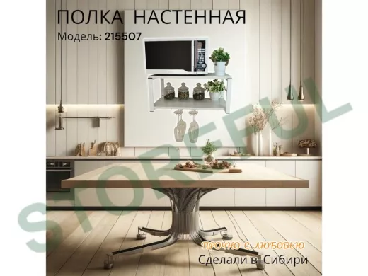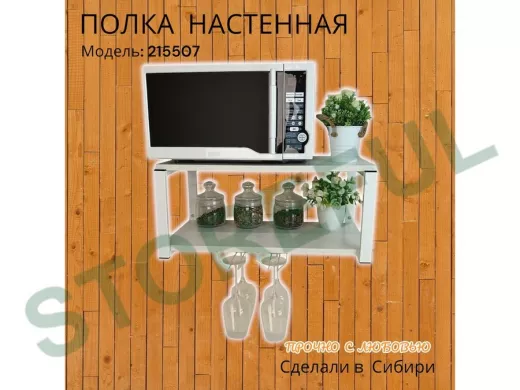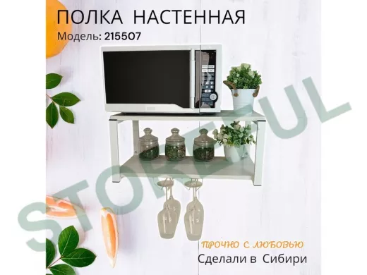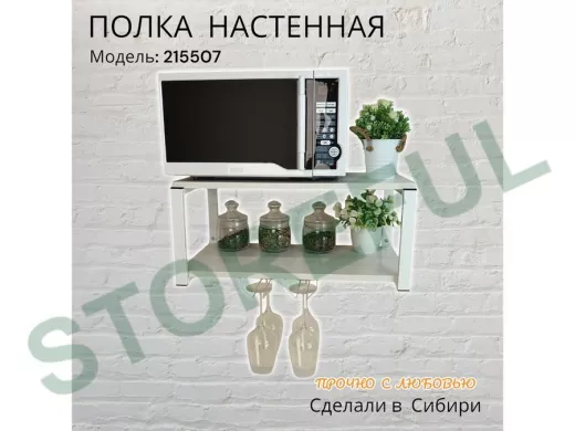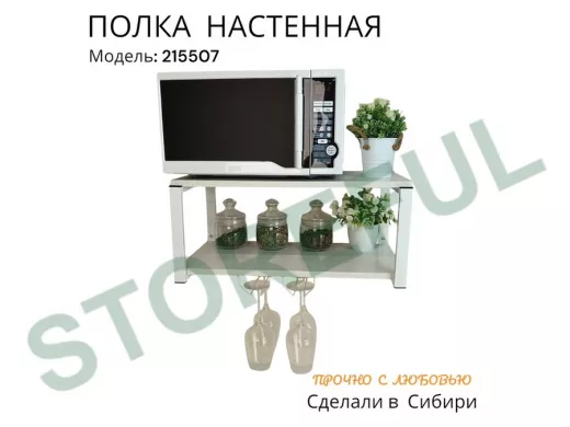• Полка надежно крепится к стене при помощи анкеров или шурупов с дюбелями, на ней можно разместить микроволновую печь, кухонную технику, посуду, специи