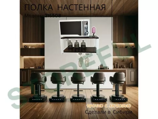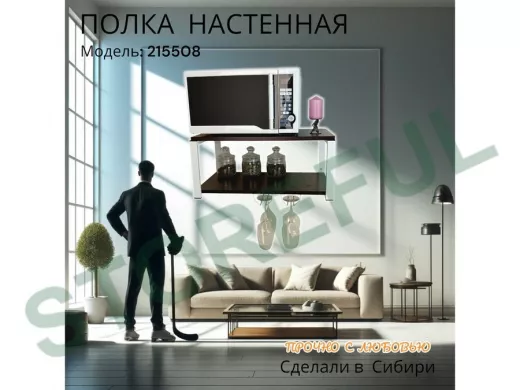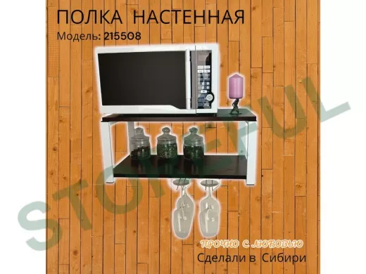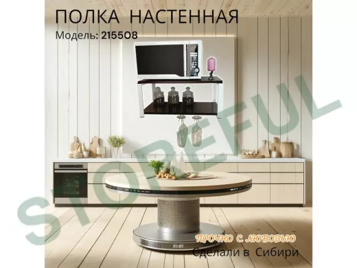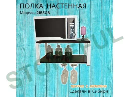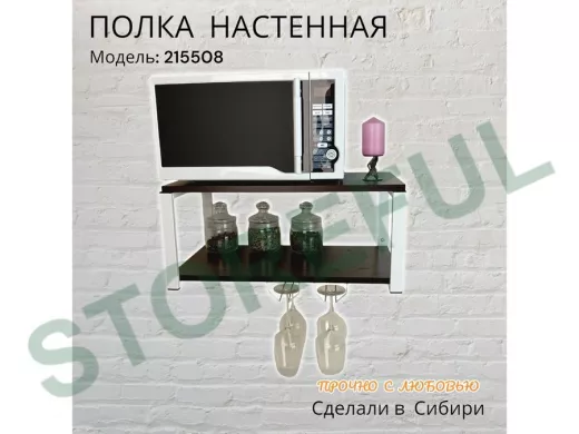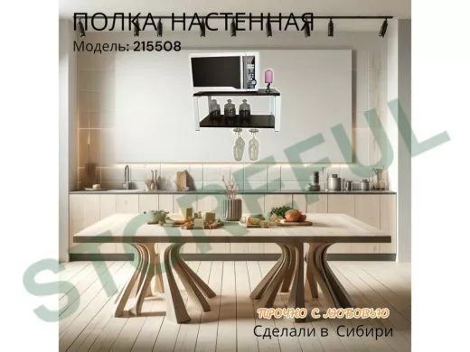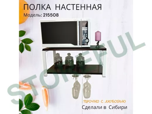 • Полка надежно крепится к стене при помощи анкеров или шурупов с дюбелями, на ней можно разместить микроволновую печь, кухонную технику, посуду, специи