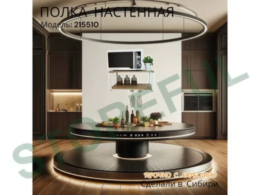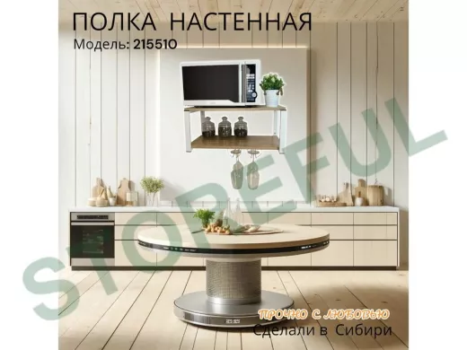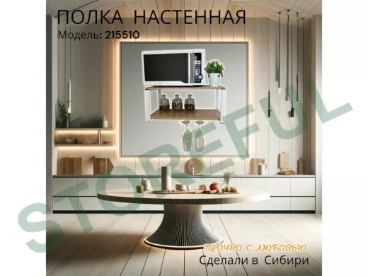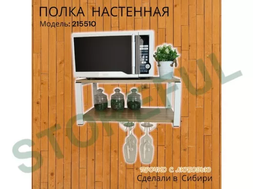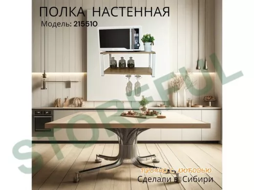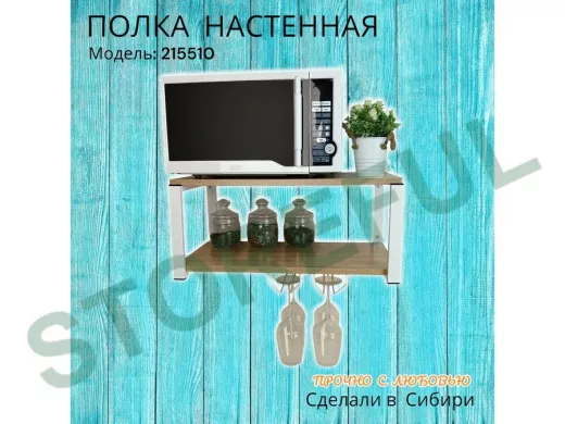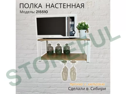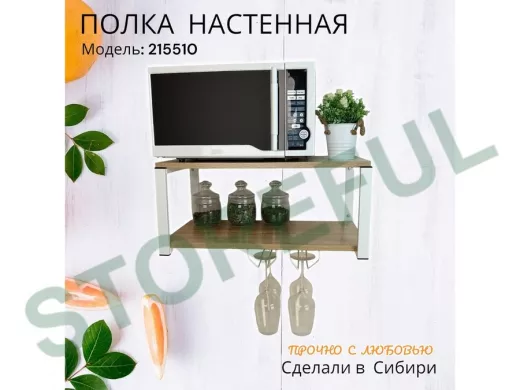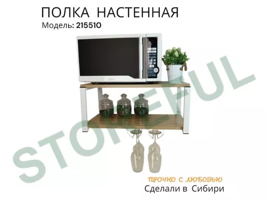 • Полка надежно крепится к стене при помощи анкеров или шурупов с дюбелями, на ней можно разместить микроволновую печь, кухонную технику, посуду, специи
