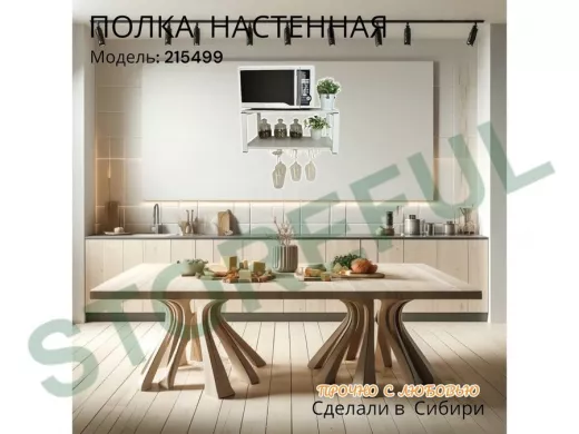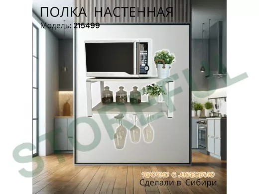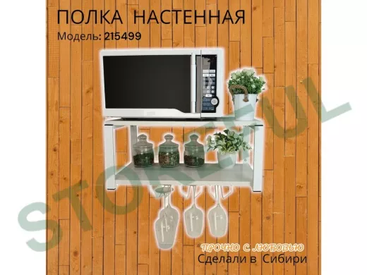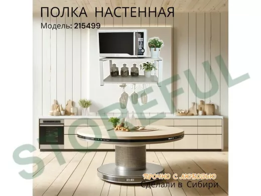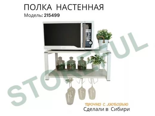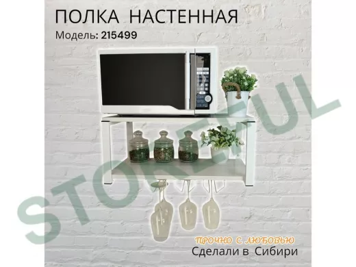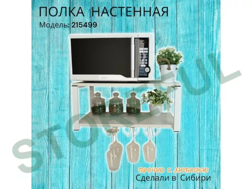 • Полка надежно крепится к стене при помощи анкеров или шурупов с дюбелями, на ней можно разместить микроволновую печь, кухонную технику, посуду, специи