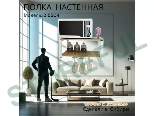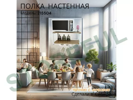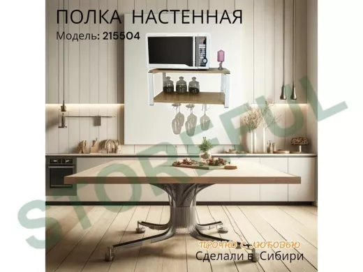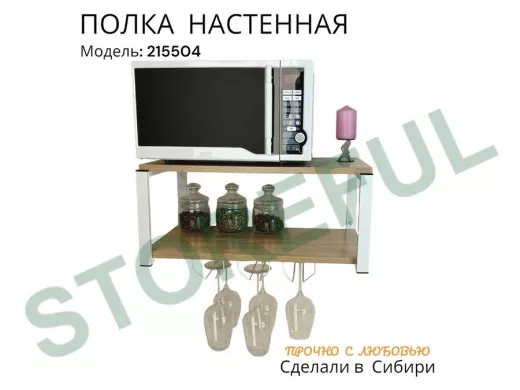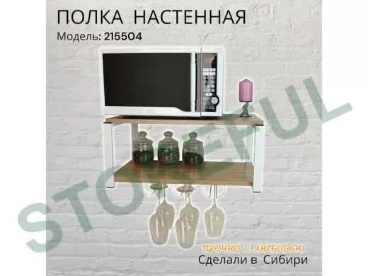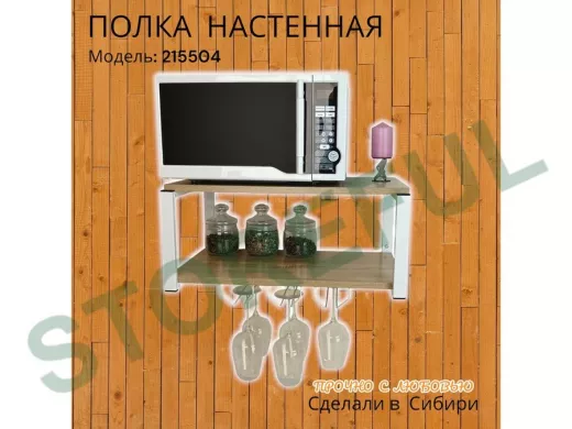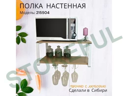 • Полка надежно крепится к стене при помощи анкеров или шурупов с дюбелями, на ней можно разместить микроволновую печь, кухонную технику, посуду, специи