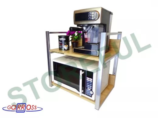 • Полка надежно крепится к стене при помощи анкеров или шурупов с дюбелями, на ней можно разместить микроволновую печь, тостер, кофемашину, чайник, посуду, специи