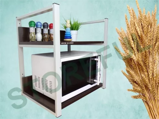 • Полка надежно крепится к стене при помощи анкеров или шурупов с дюбелями, на ней можно разместить микроволновую печь, тостер, кофемашину, чайник, посуду, специи