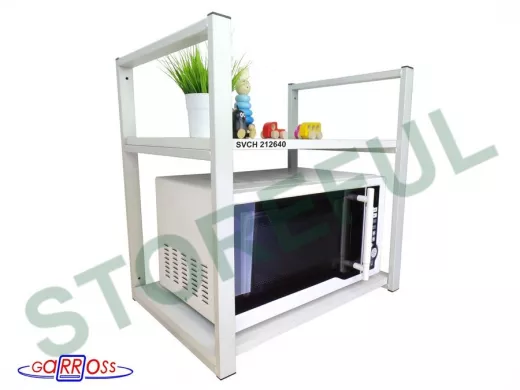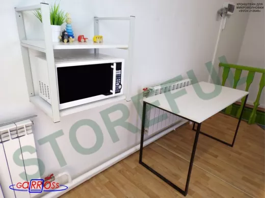 • Полка надежно крепится к стене при помощи анкеров или шурупов с дюбелями, на ней можно разместить микроволновую печь, кухонную технику, посуду, специи