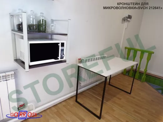 • Полка надежно крепится к стене при помощи анкеров или шурупов с дюбелями, на ней можно разместить микроволновую печь, кухонную технику, посуду, специи