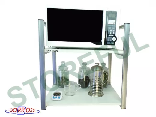 • Полка надежно крепится к стене при помощи анкеров или шурупов с дюбелями, на ней можно разместить микроволновую печь, кухонную технику, посуду, специи