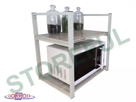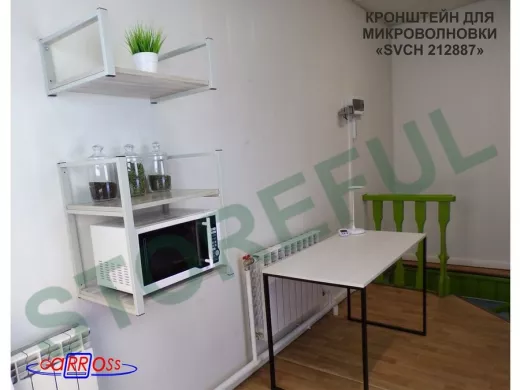 • Полка надежно крепится к стене при помощи анкеров или шурупов с дюбелями, на ней можно разместить микроволновую печь, кухонную технику, посуду, специи