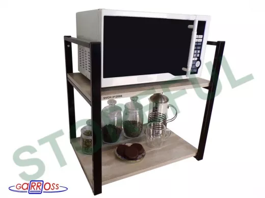 • Полка надежно крепится к стене при помощи анкеров или шурупов с дюбелями, на ней можно разместить микроволновую печь, кухонную технику, посуду, специи